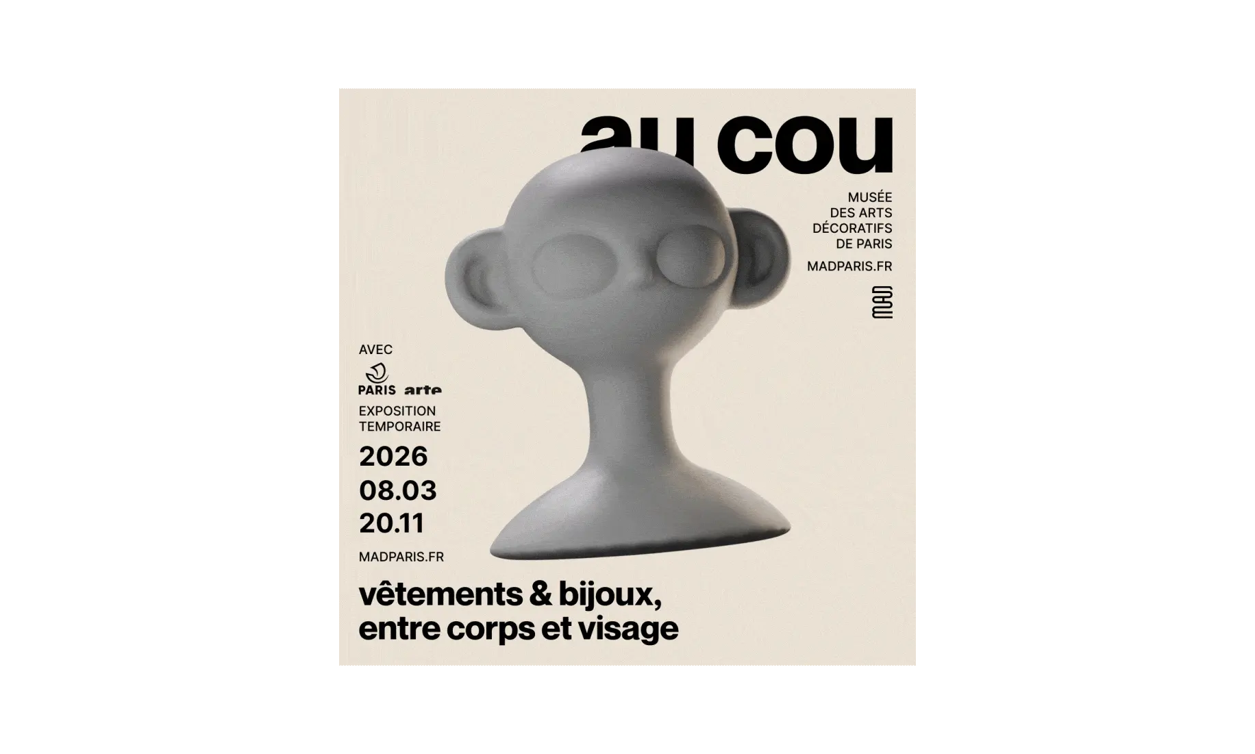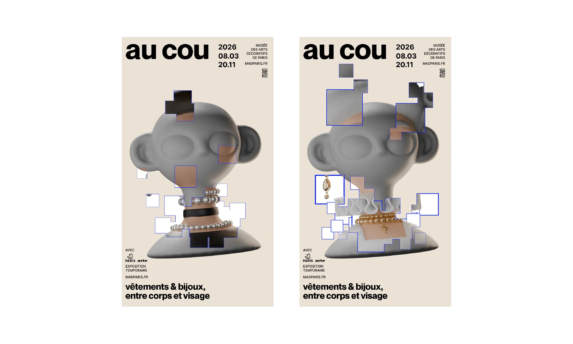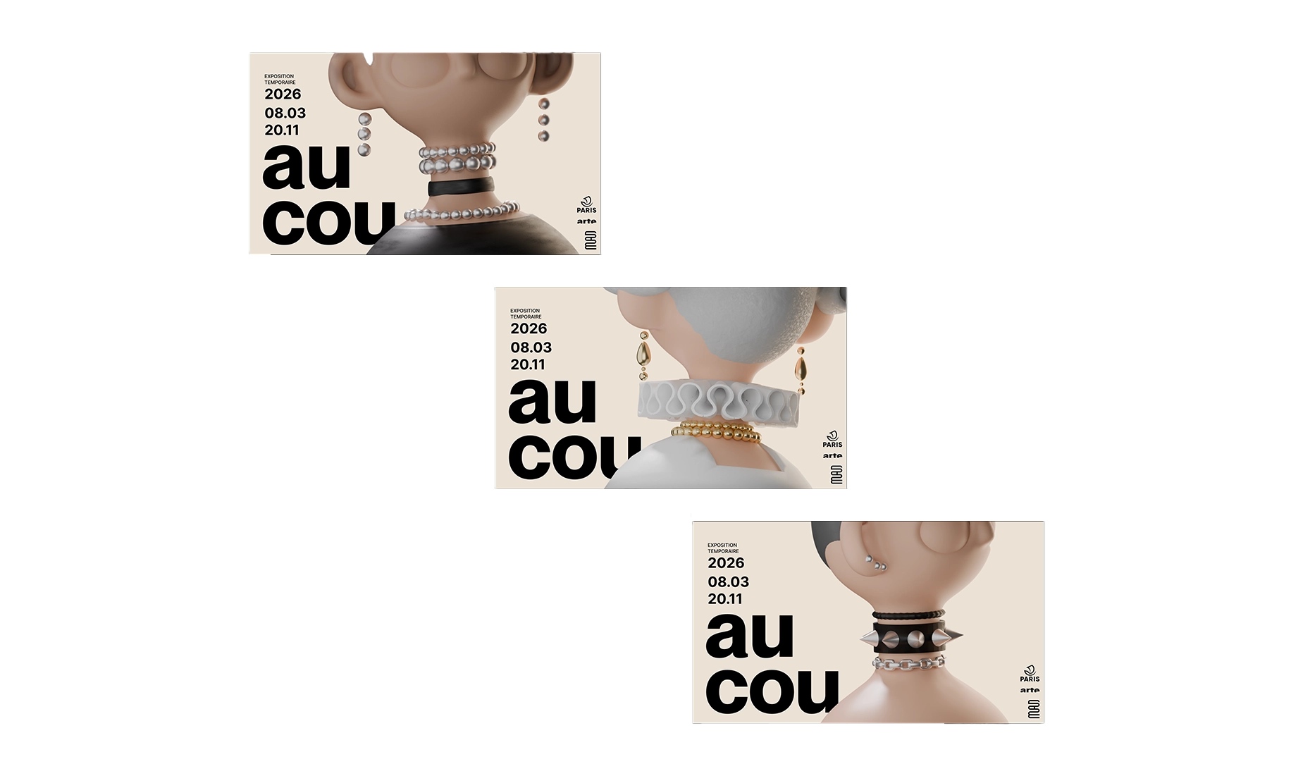 Réalisation d’une affiche animée pour l’exposition fictive “Au Cou” pour le Musée des Arts Décoratifs de Paris. Déclinaison de la direction artistique en post réseaux sociaux et header web.