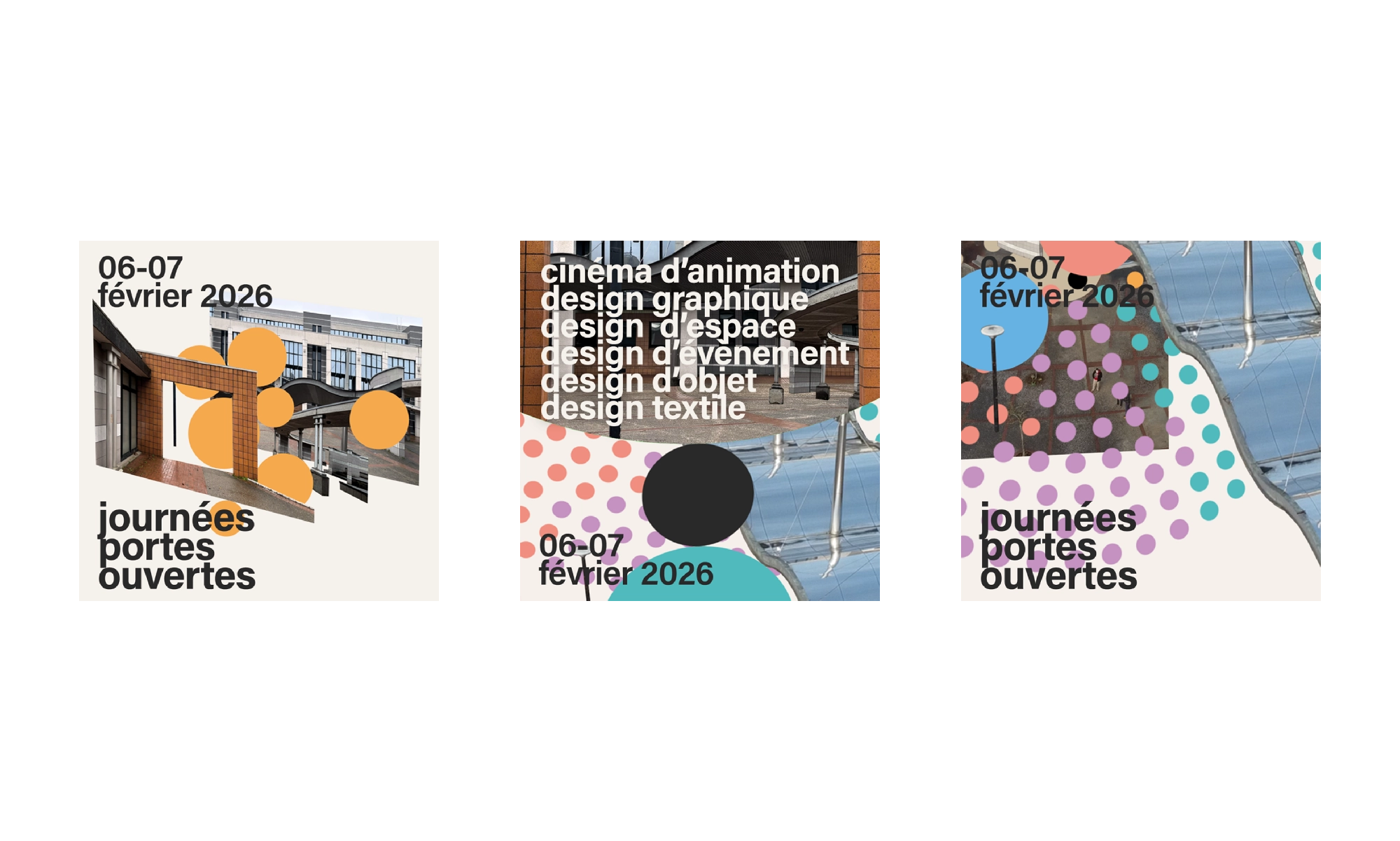 Proposition de communication visuelle pour les journées portes ouvertes de l’École Supérieure d'Arts Appliqués et Textile de Roubaix, déclinée sur plusieurs supports (affiche, réseaux sociaux, web) autour de la thématique « tourné vers l’avenir ».