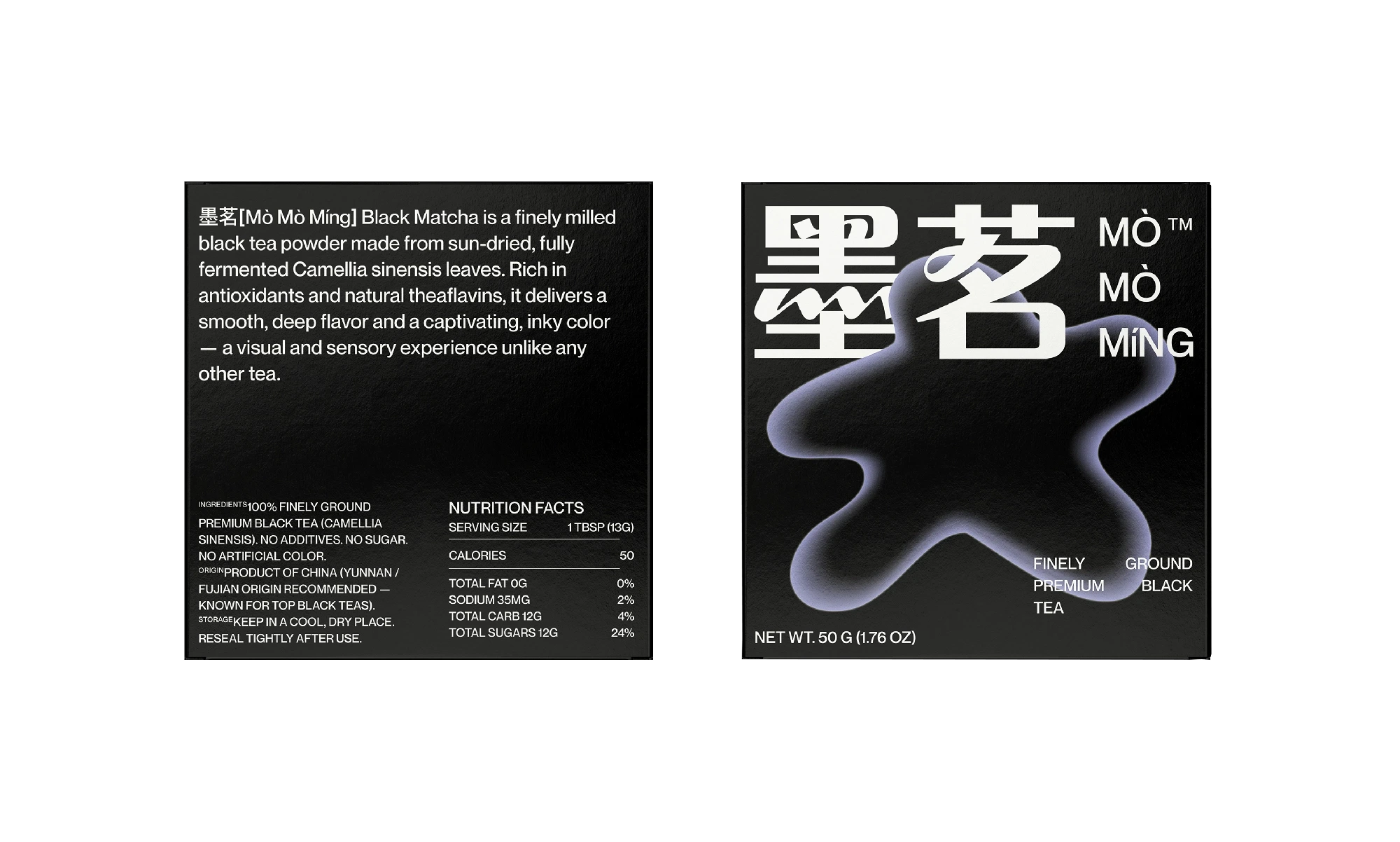 Branding fictif pour la marque Mò Mò Míng, qui vend une nouvelle sorte de thé noir en poudre.