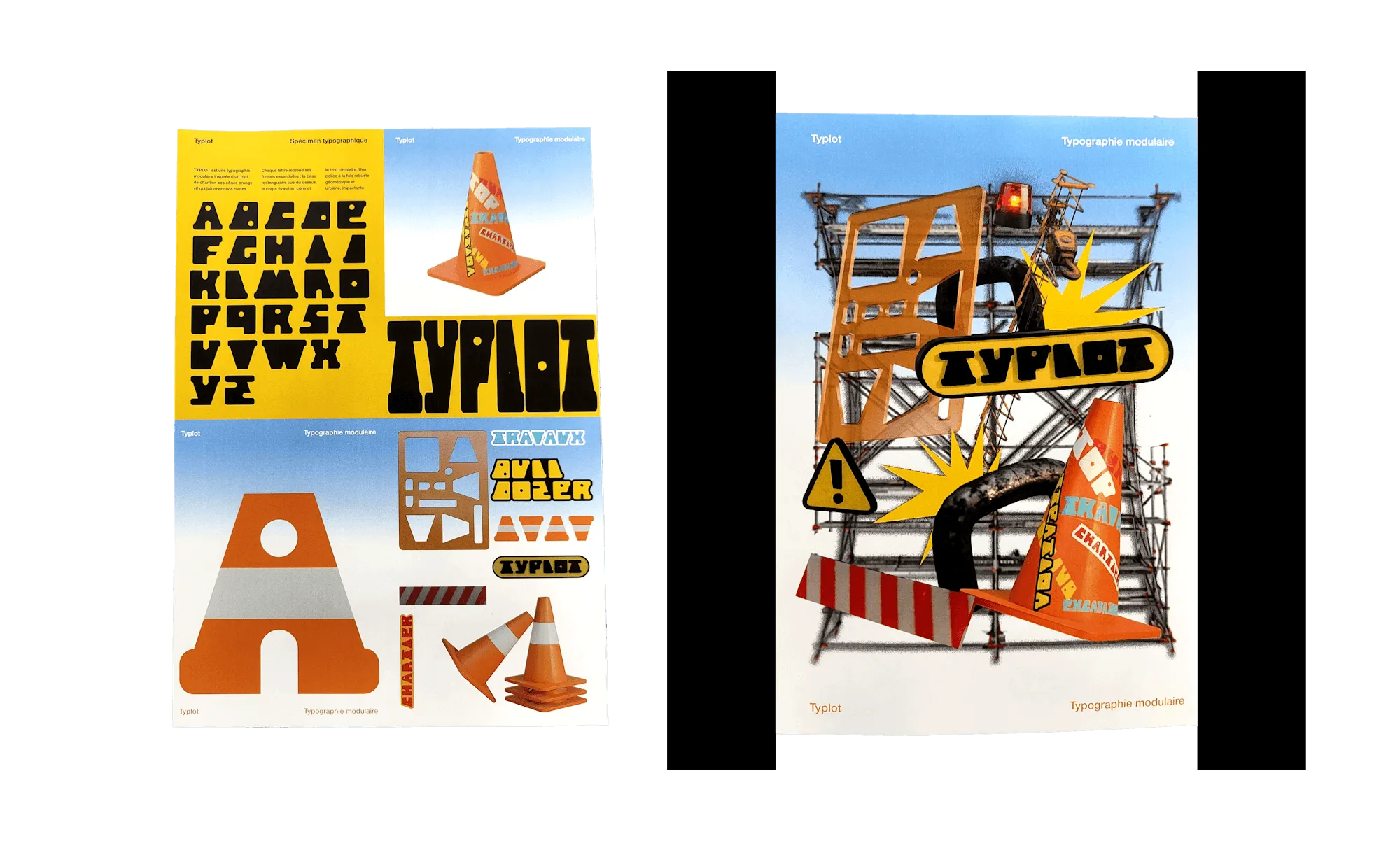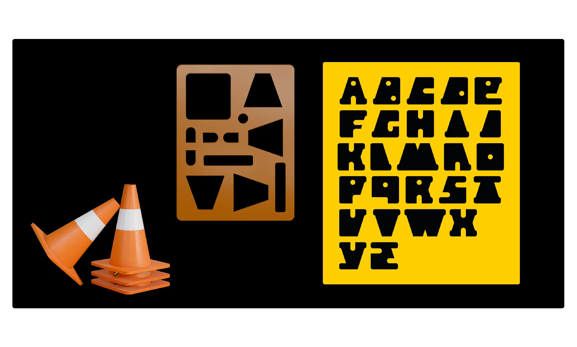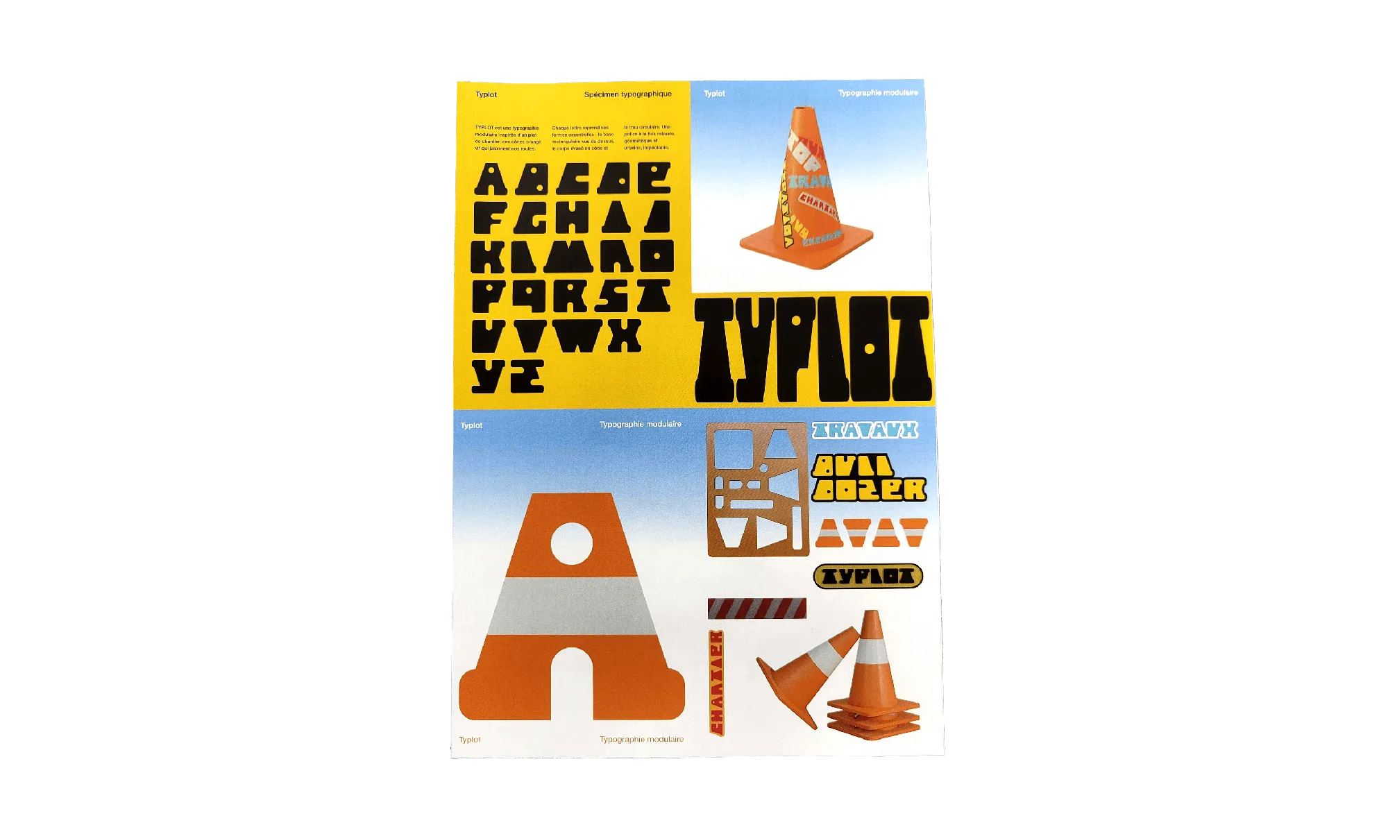 Fonte créée au cours d'un exercice typographique consistant à élaborer une typographie complète à partir d’un objet ; en l’occurence un plot de signalisation.
